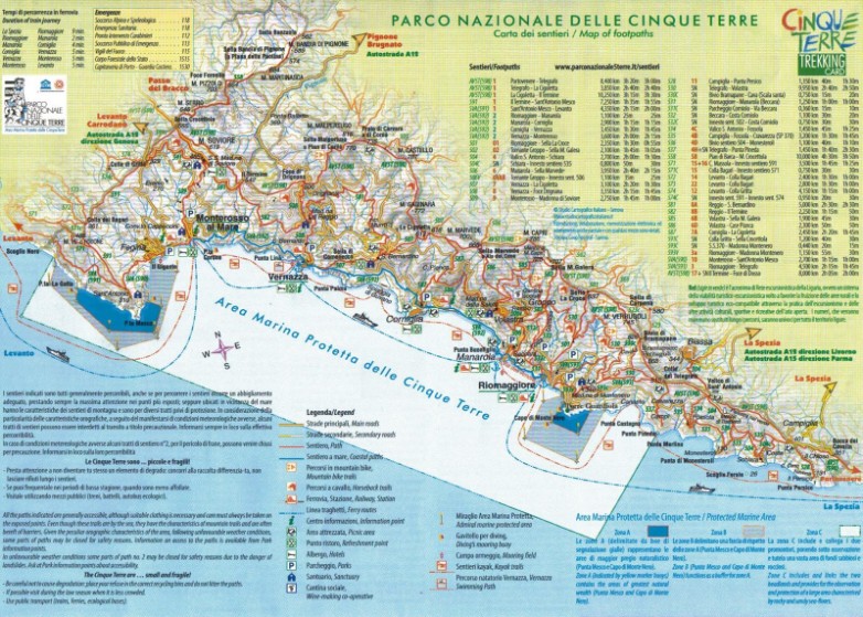 Les Cinq Terres doivent en bonne partie leur renommée aux nombreux sentiers qui sillonnent, comme une toile d'araignée, le versant marin de leurs montagnes. Autrefois seules voies de communication, non seulement entre les cinq villages, mais également vers le chef lieu du département et vers l'intérieur des terres, ces parcours représentent aujourd'hui une excellente approche à la connaissance de ce territoire.